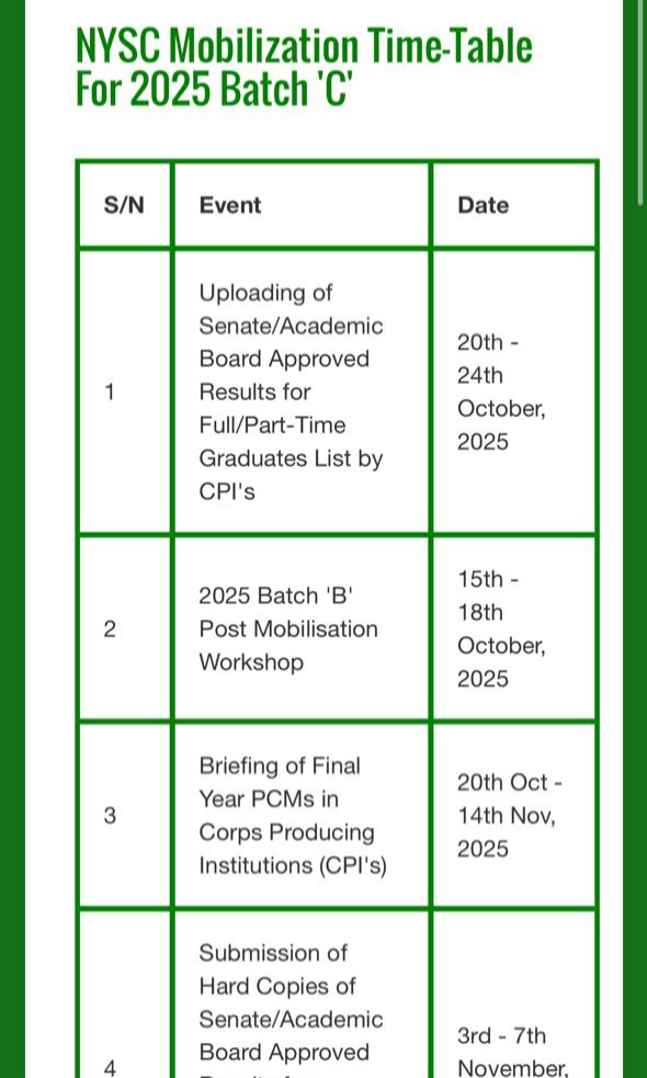 The National Youth Service Corps (NYSC) has released the 2025 Mobilisation timetable for 2025 Batch ‘C’.