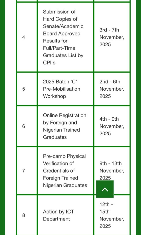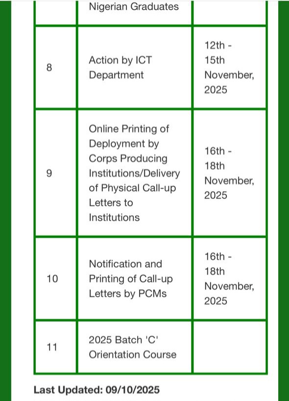 The National Youth Service Corps (NYSC) has released the 2025 Mobilisation timetable for 2025 Batch ‘C’.