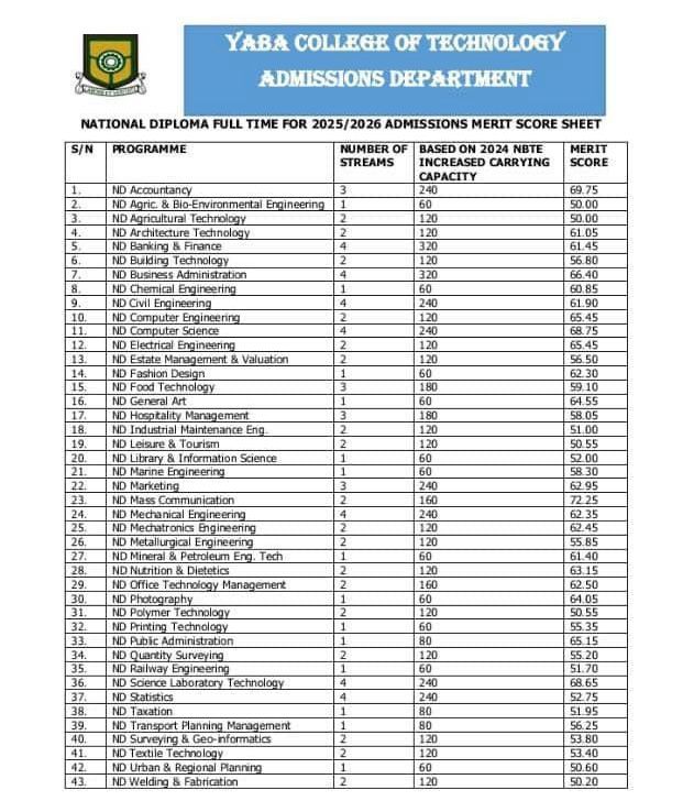 The Yaba College of Technology (YABATECH) has released the minimum UTME cut-off marks for admission into its National Diploma (ND) and B.Sc. (Education) programs for the 2025/2026 Academic Session.
