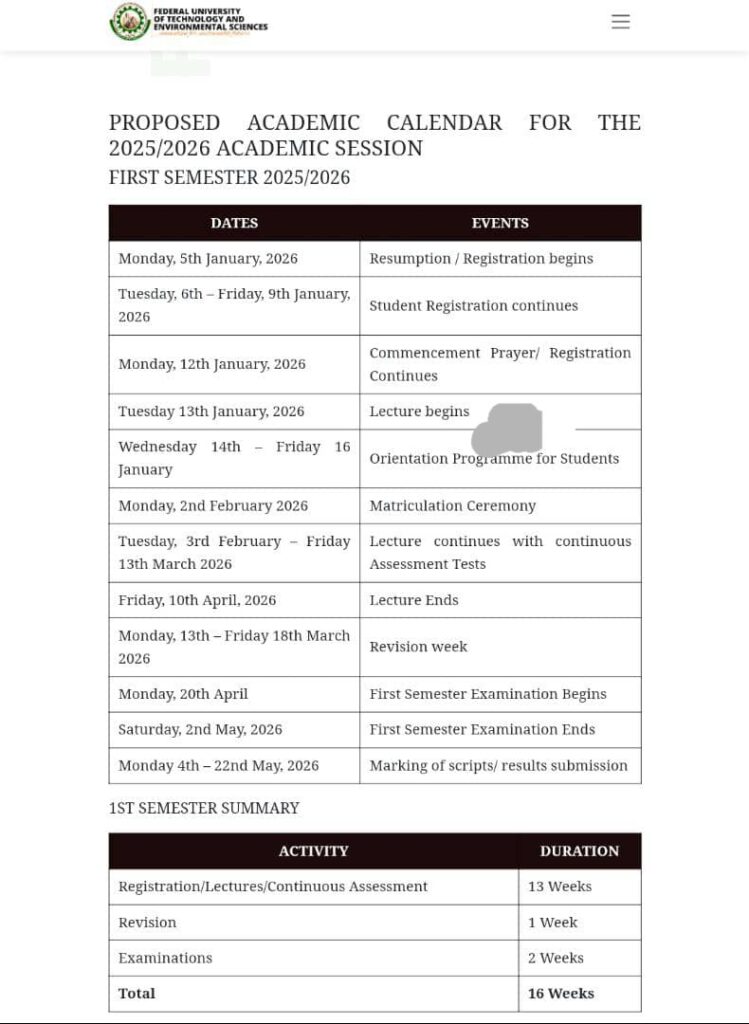 The Federal University of Technology and environmental sciences (FUTES) has released the proposed academic calendar for the 2025/2026 academic calendar.