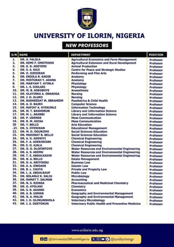 The University of Ilorin has announced the promotion of 43 academic staff members to the rank of Professor, marking a significant milestone in the institution’s commitment to academic excellence and research development.